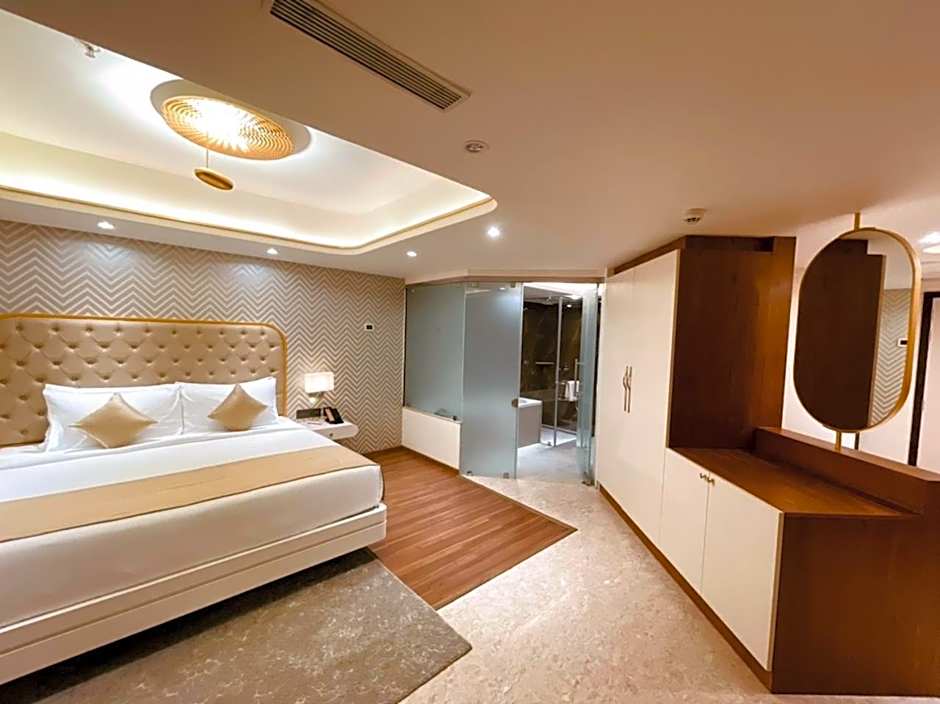 The spacious suite features air conditioning, soundproof walls, a balcony with city views as well as a private bathroom boasting a bath. The unit has 1 bed.